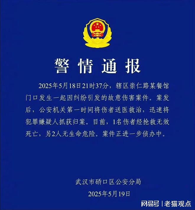 5月19日上午,武汉市公安局硚口区公安分局特地发布警情通报,回应此事。通报证实,5月18日21时37分,位于崇仁路某餐馆门口发生一起故意伤害案,1名伤者经抢救无效死亡,另外2人无生命危险。