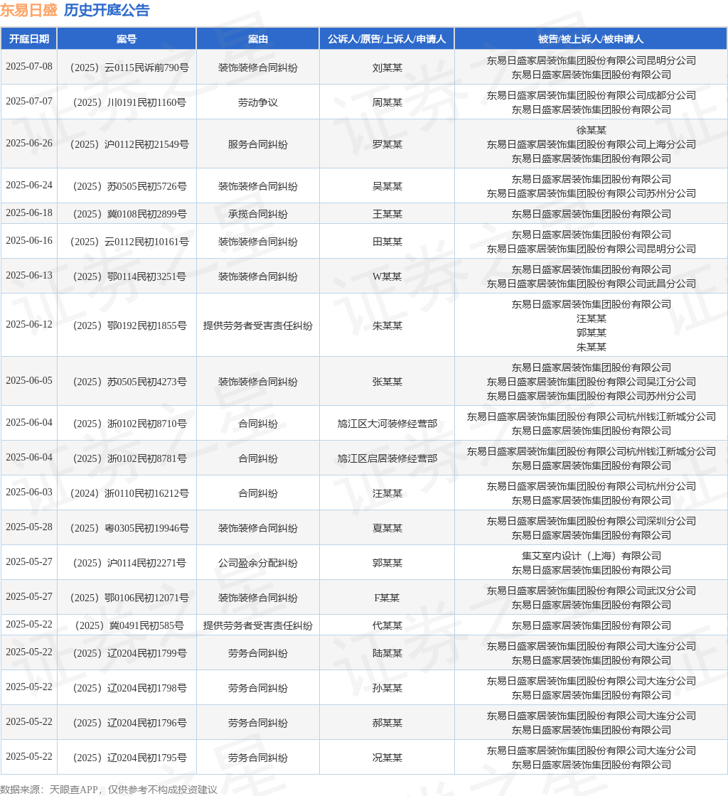 根据统计,近一年内以东易日盛家居装饰集团股份有限公司为当事人的历史开庭公告有782则,其中案由为“装饰装修合同纠纷”的公告以403则居首,其次为“买卖合同纠纷”有130则,“劳务合同纠纷”有63则。历史开庭公告(前20条)如下: